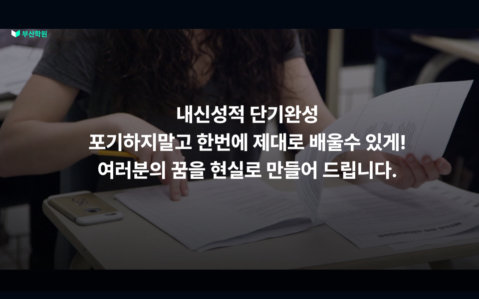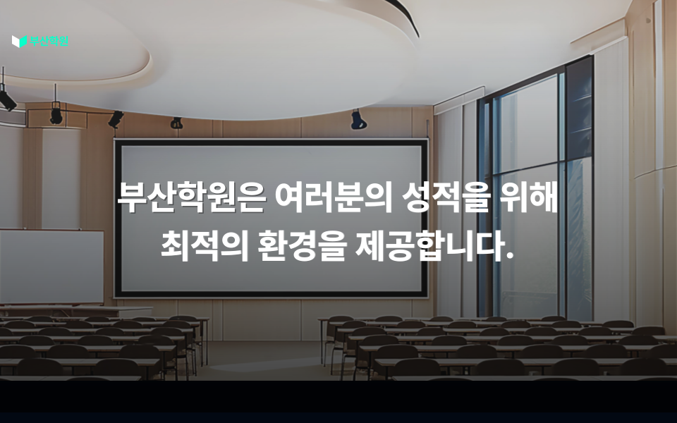 부산학원은 다릅니다. 부산 최초! 개인 학습관리 시스템 도입 부산 유일! 매월 출제 트렌드를 반영한 모의고사! 1등 선생님들의 체계적 관리를 통해 꼭 필요한 문제만 공부하고, 이해할 수 있게 눈 높이별로 설명합니다.